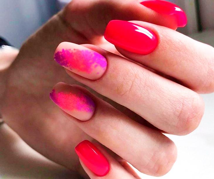 Броское сочетание неоновых цветов в составе красного маникюра – выбор смелых женщин, не боящихся всегда быть в авангарде. Подходит тем, кто имеет свой собственный стиль, юным в душе и дерзким.