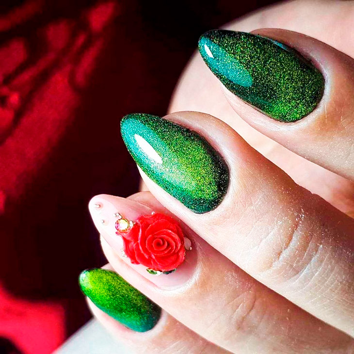 Бьёт рекорды по популярности шеллак оттенка «Изумруд» особенно для короткой длины ногтей. А ведь еще летом все были без ума от салатовых и неоновых ногтей. Но в 2021 году неоновые ногти шеллаком — антитренд. Сейчас на пике популярности более глубокие оттенки зеленого, как: оливковый, малахитовый, виридан, мятный, нефрит. Смотрите фото: