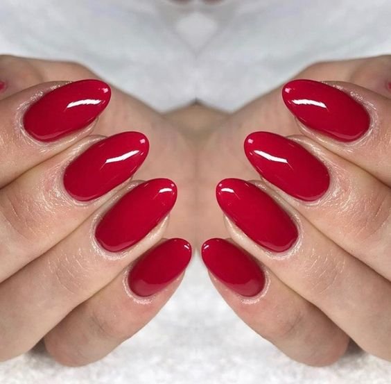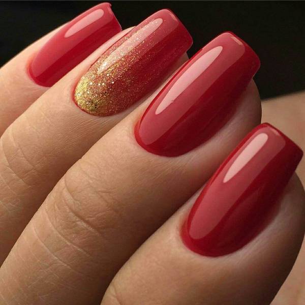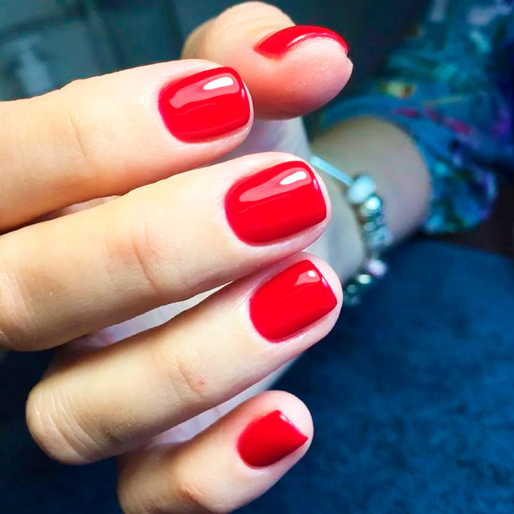 Красный лак особенно на коротких ногтях смотрится потрясающе. Можно выбрать один из оттенков красного шеллака, которые в тренде: винный, бордо, холодный красный, сатиновый, медный.