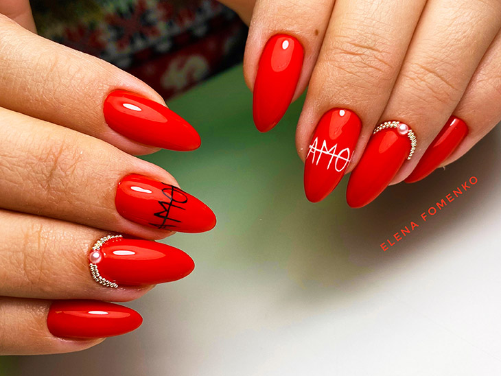 Красный маникюр с надписями является хорошей идеей для тех, кто любит необычные варианты дизайна ногтей. Наносить надпись на ногти можно не только в виде рисунка, но и при помощи лака с надписью.