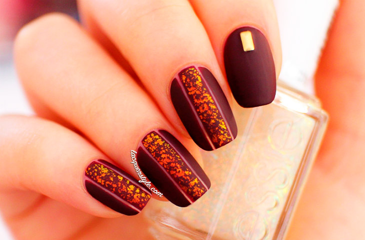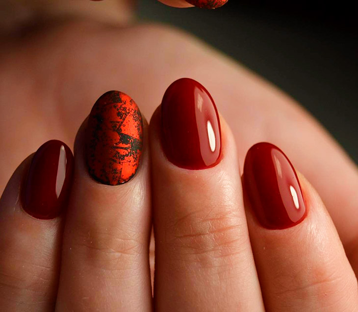 Удачное решение для тех, кто любит мягкие образы, в душе – на половину бунтарь, на вторую – конформист. В принципе, это сочетание близких цветов, а при наличии схожих по цвету вещей в гардеробе, подобный красный маникюр с коричневый и шоколадным может стать очень удачным.