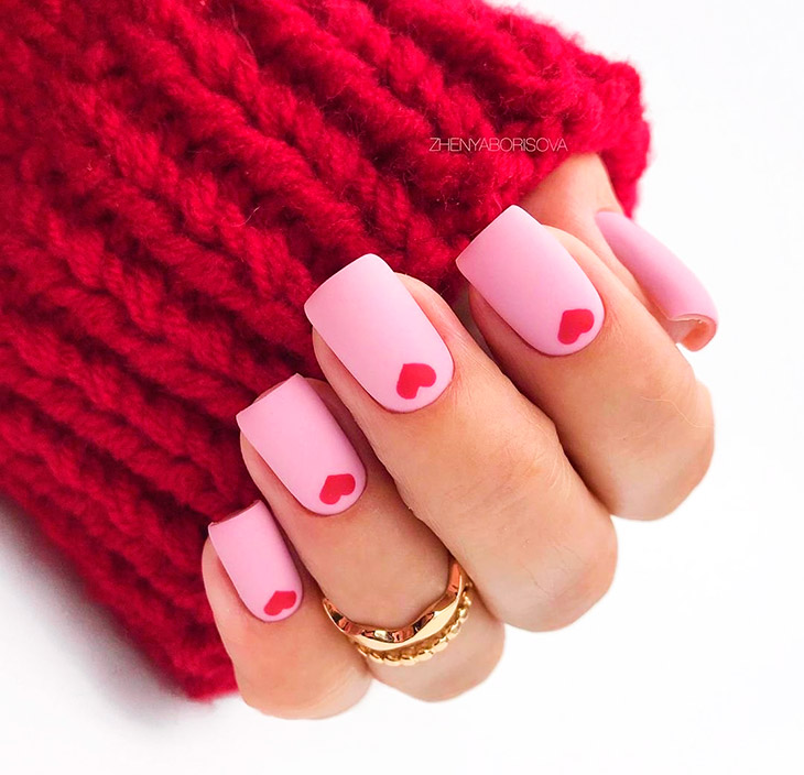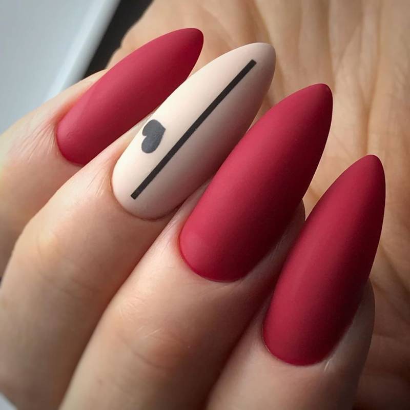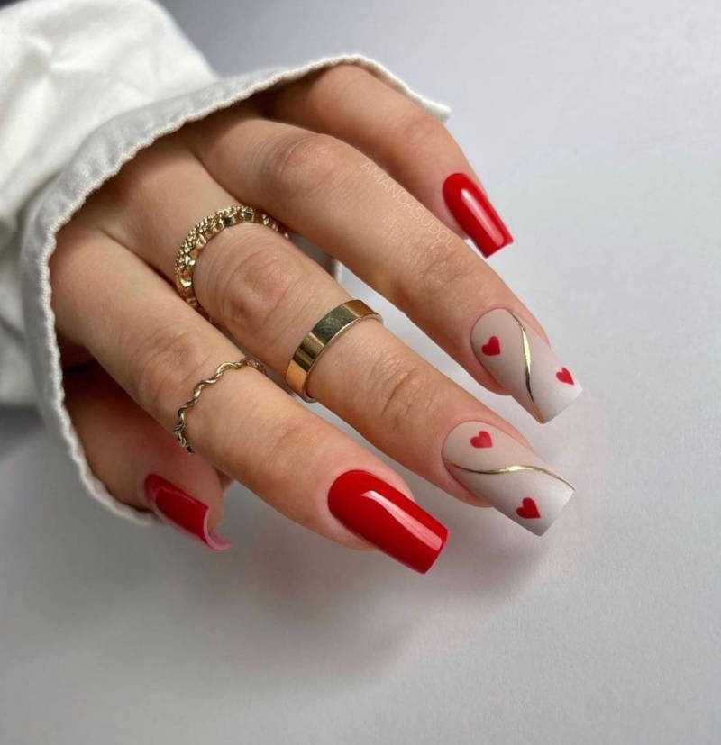 Дизайн красного маникюра с изображением глянцевых сердец на матовом фоне
