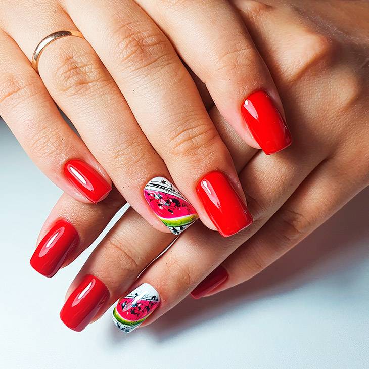 Готовы сочетать красный гель-лак с принтами цветов, листьев или спелых ягод? Их лучше подобрать в тон покрытия и разместить на нейтральном фоне. Тогда принты не будут «резать» глаза и портить дизайн.