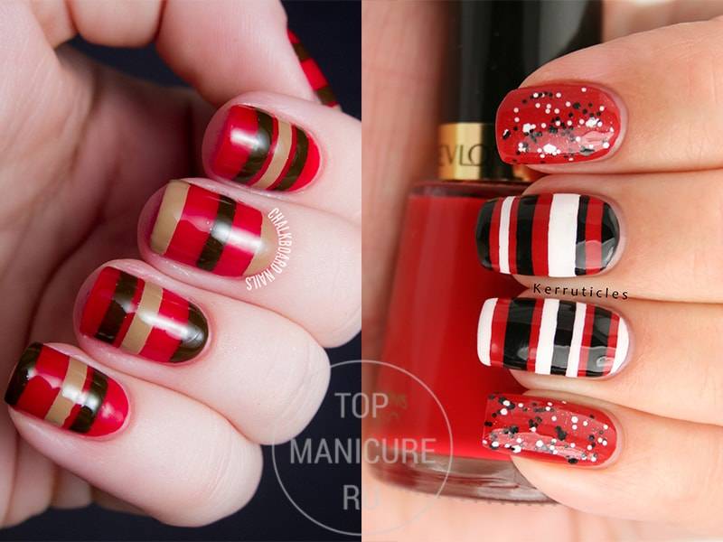 Фото 4. Красно-белый маникюр с полосками лучше всего делать с помощью ленты для дизайна. Основой здесь выступает белый лак. Закрываем кусочками ленты части ногтевой пластины, открытые полосы прокрашиваем красным оттенком лака.
