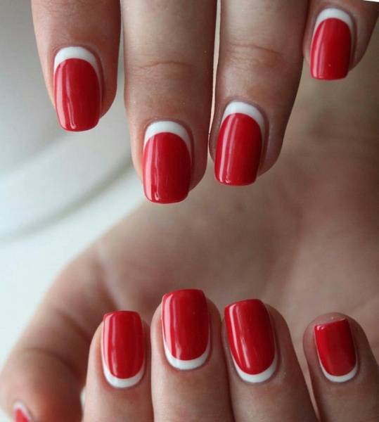 С красным маникюром на коротких ногтях гармонируют лунки, омбре (черный, белый, телесный, оранжевый, зеленый, синий и множество других цветов).