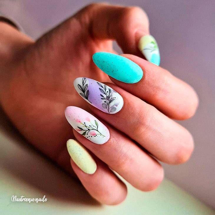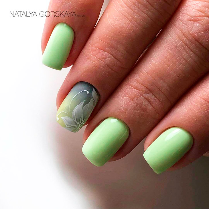 Флористическая тема как нельзя лучше подходит легкому и спокойному маникюру. Ведь цветы очень просто нарисовать, можно использовать трендовые точки. Особенно интересна растительность на контрасте: когда бутон того же цвета, что и все ноготки, нарисован на светлой основе.
