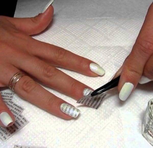 Красоту этого дизайна вы можете оценить на фото. Для оформления ногтей подготовьте старую газету, емкость, маникюрные ножнички, основу-лак, немного спирта (это может быть водка) и фиксирующий топ.
