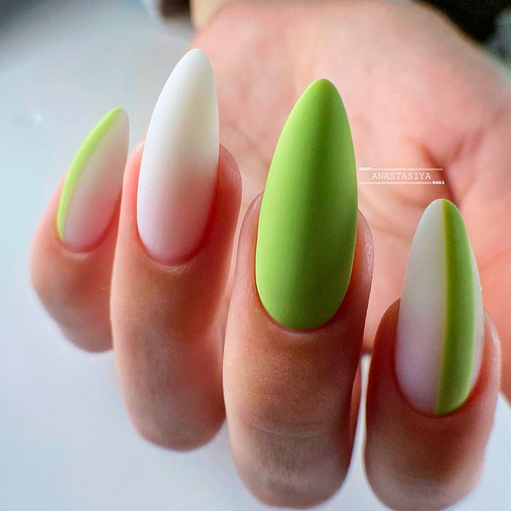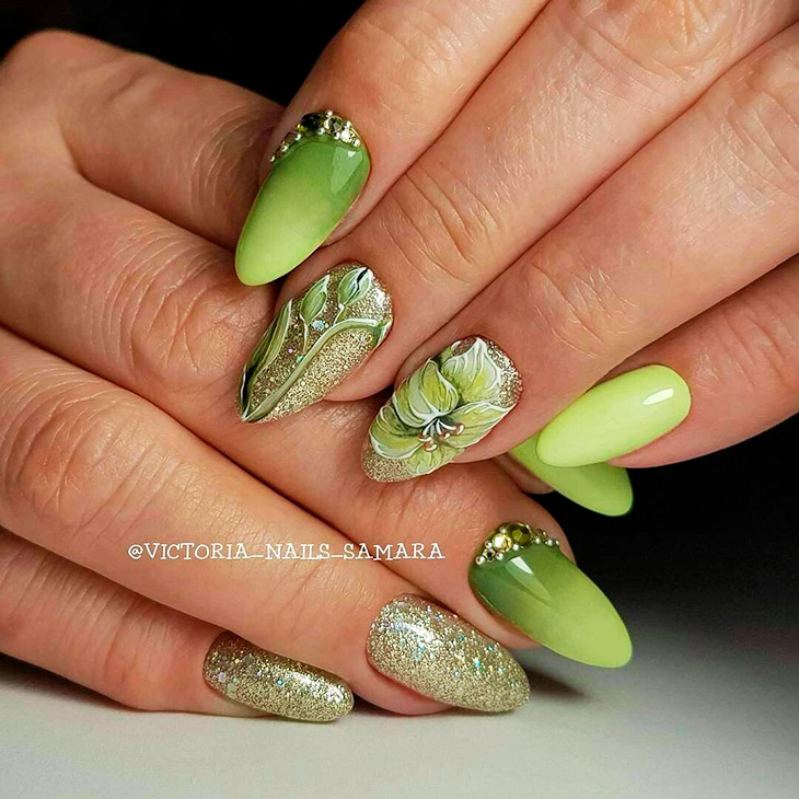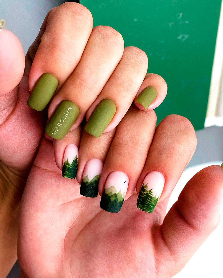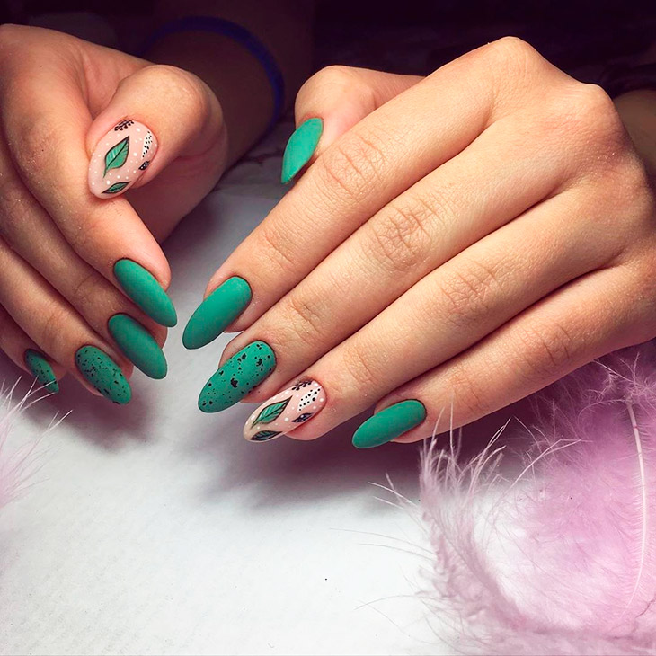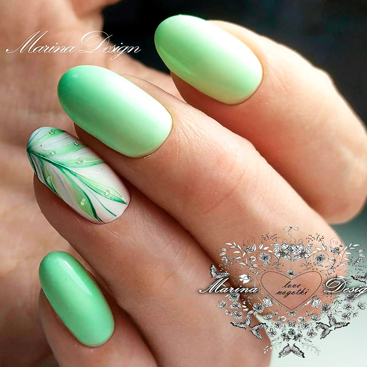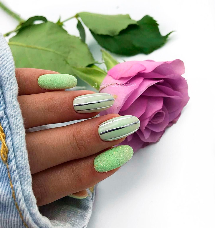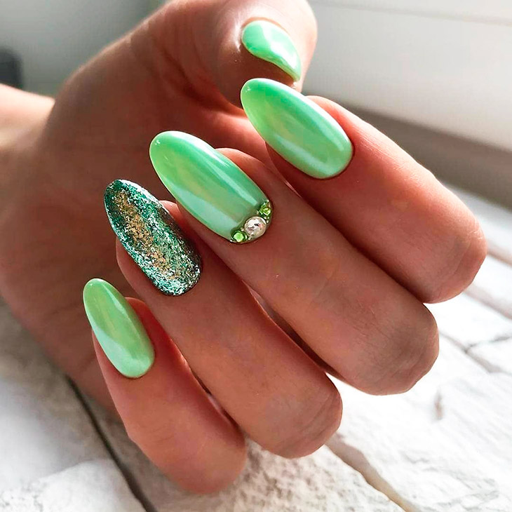 Комбинировать маникюр с зелёным нужно осторожно. Тон уместно сочетать в качестве акцентов