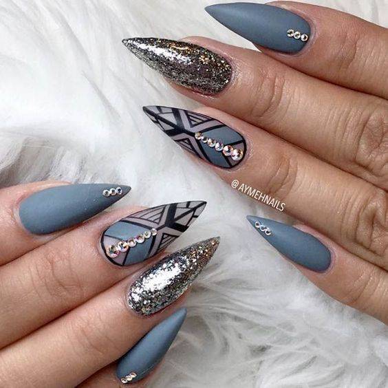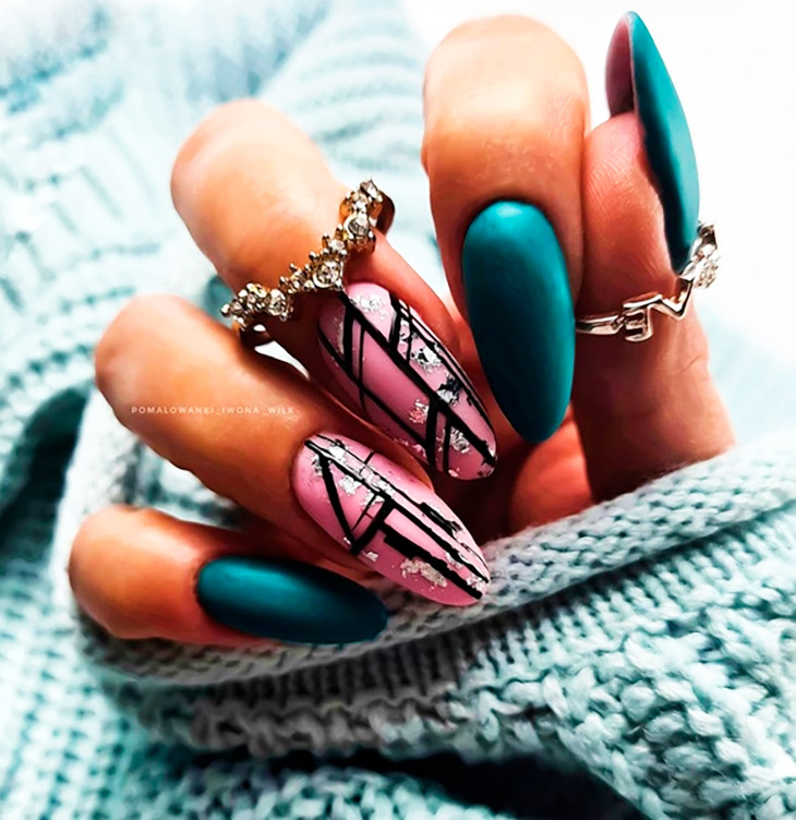 Геометрия – универсальное решение для работы и на каждый день. В сочетании с насыщенно-яркими красками, фольгой и блестящим декором, она раскрывает весь свой потенциал, дополняя праздничный образ. Используют параллельные и пересекающиеся линии, полоски, треугольники и причудливые фигуры. Их можно дополнять техниками градиент, френч, втирками и «кошачьим глазом». Очень интересен дизайн с фигурами из «битого стекла».