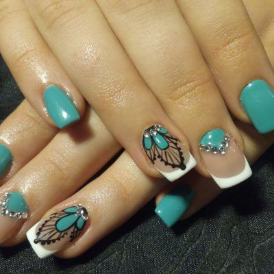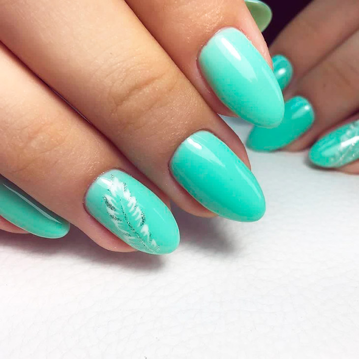 На сегодняшний день, бирюзовый цвет приобрёл популярность не только в маникюре. Он самый сдержанный и одновременно яркий. Сочетается с нежными обликами и украшениями.