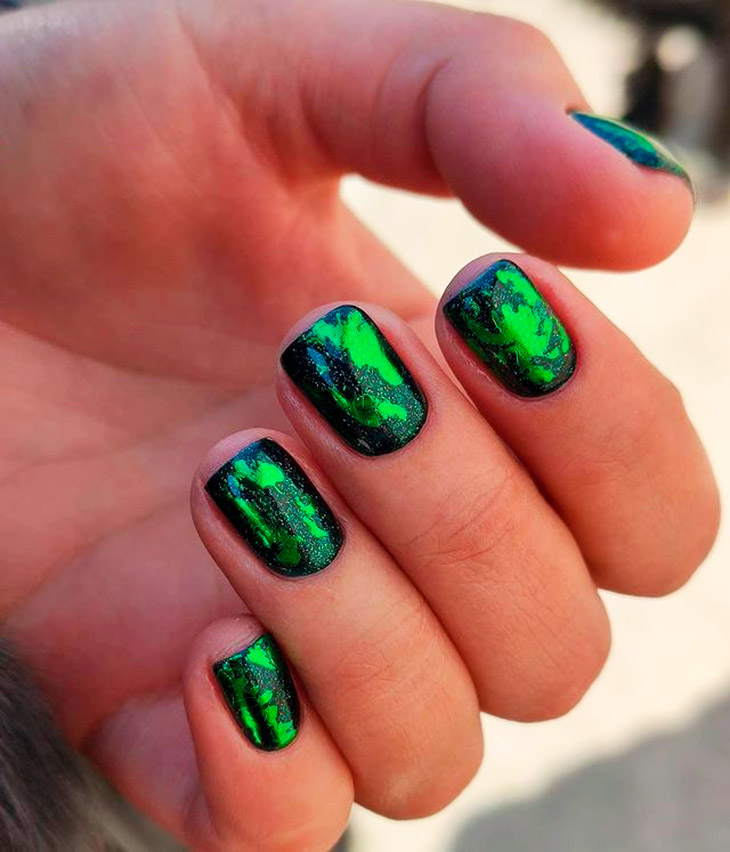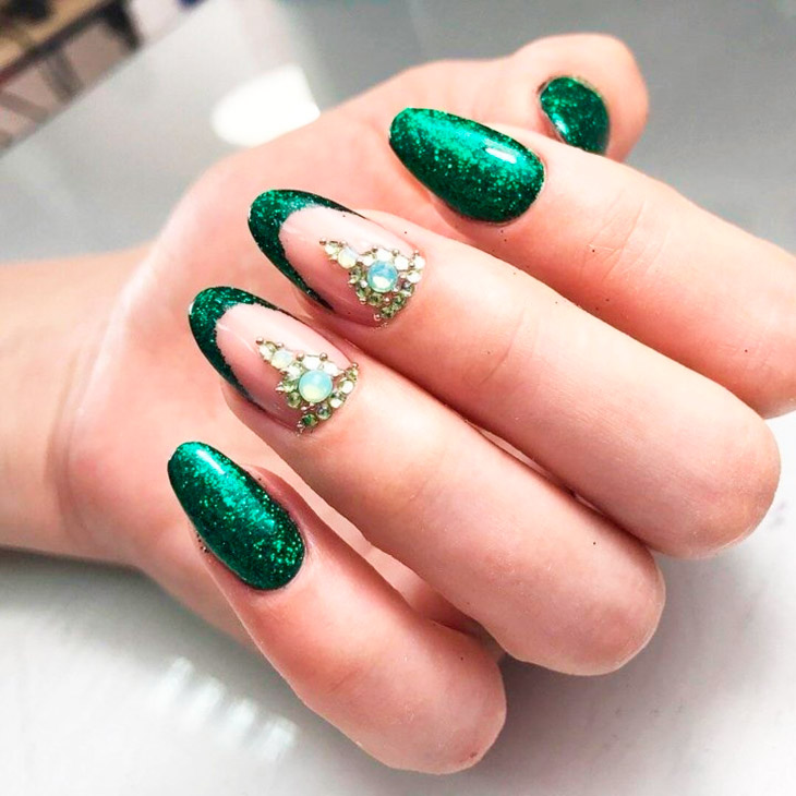 Насыщенный цвет не терпящий излишек. Самая актуальная классическая комбинация – это чёрно-зелёный или золото. В оформление маникюра лучше остановиться на френче, кошачьем глазе или небольшом количестве страз.