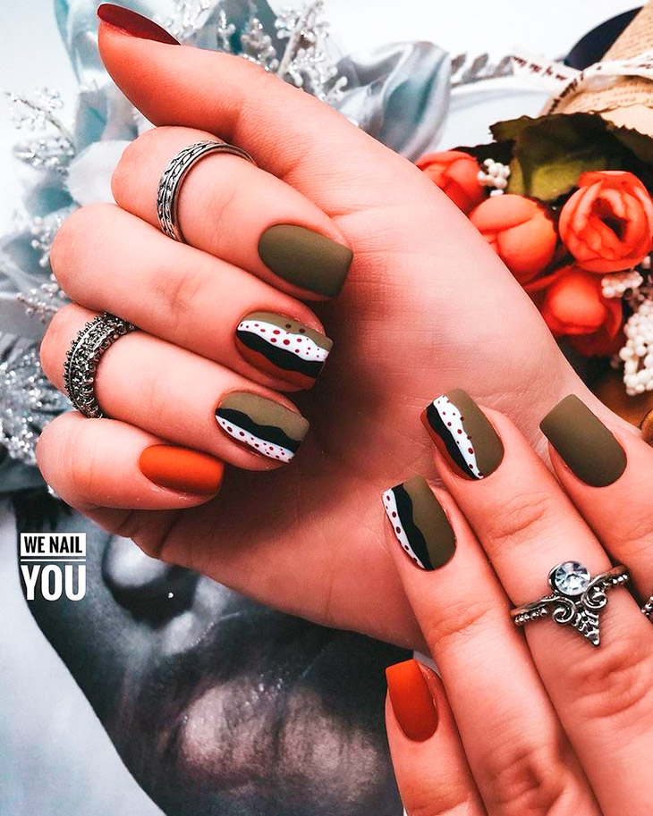 Хаки не самый актуальный так как не является базовым, поэтому нечасто используется в маникюре. Дополнительный цвет лучше смотрится в выделяющихся оттенках. Стразы на матовом топе или геометрия приемлемые варианты в маникюре на сегодняшний день.