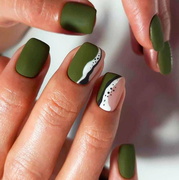 Оливковый – оригинальный цвет, сочетается с анималистическим дизайном, с повседневной одеждой. Может быть акцентом или дополнением в другом виде маникюра.