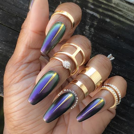 Мерцающий эффект создается с помощью глиттеров (блесток) и различных переливающихся пигментов. Это может быть как мелкая искорка на всей поверхности ногтя, так и сияющие акценты на определенных участках. Мерцающий эффект придает ногтям яркость и элегантность.