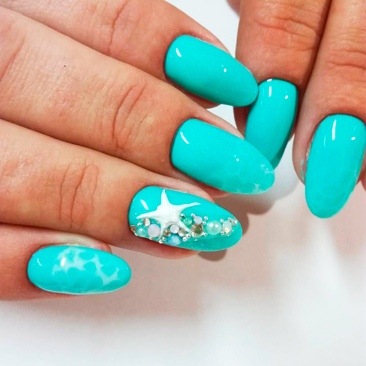 Часто используется в путешествиях. Морской цвет самодостаточный, но для придания единства, иногда выбирают светлые и розовые лаки.