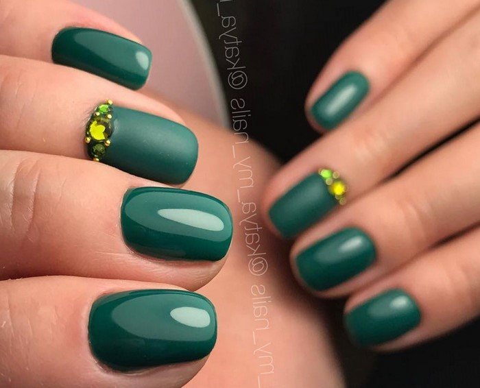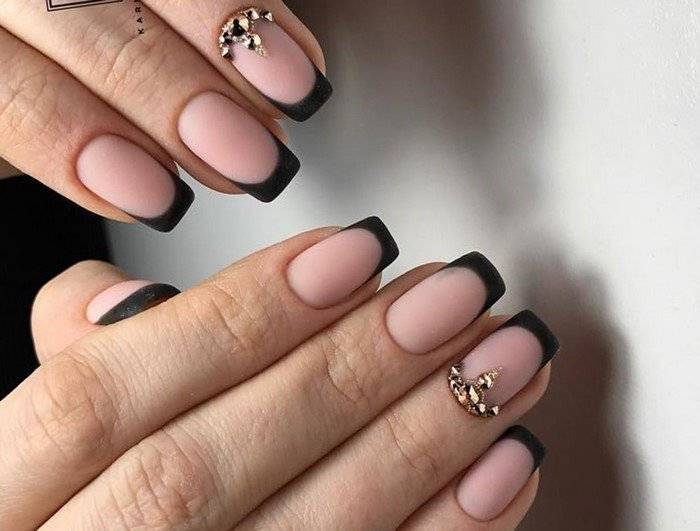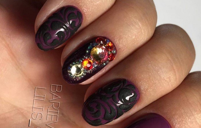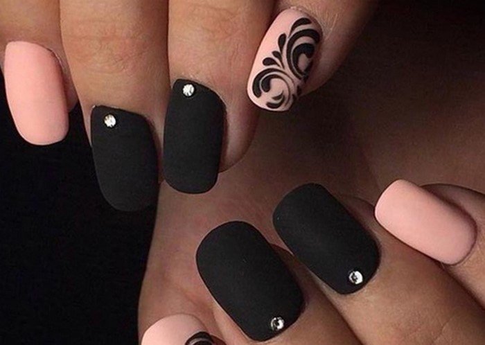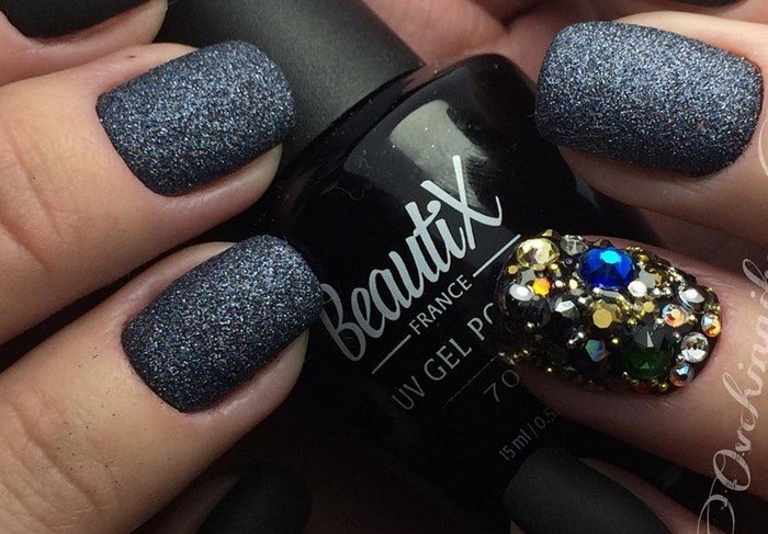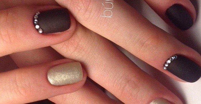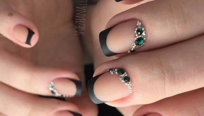 Если вы фанатка декора со стразами, обязательно сделайте черный маникюр. Он выгодно оттеняет блеск камней и декор будет заметным, не потеряется на фоне яркого цвета. Рекомендуем сочетать камни с матовой текстурой, чтобы они солировали в дизайне.