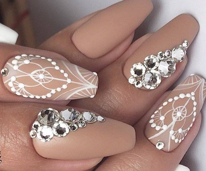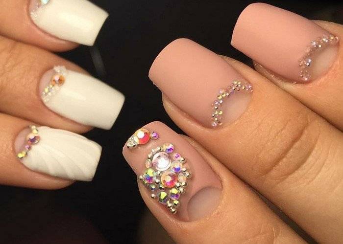 Еще один беспроигрышный вариант маникюра. Белый — это чистая база, на которой узор из камней смотрится свежо и интересно. И не стоит отдавать предпочтение только серебристым камням, выбирайте любой оттенок.