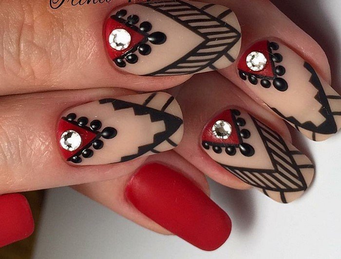 Если вы поклонница именно этого вида украшения, целесообразно к алым оттенкам выбирать бесцветные или стразы с переливом. Название дизайна «Ее величество Роскошь» говорит само за себя и предполагает использование в работе и круглых, и квадратных и треугольных кристалликов.