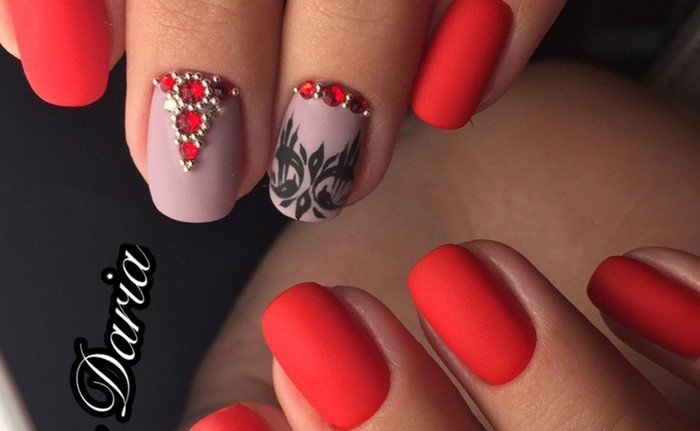 Алый матовый лак на обеих руках, а на одном ноготке причудливая фигурка из маленьких стразиков с серебристым отливом. Другой вариант – на ногте большой красный камешек посередине, а вокруг него размещены бесцветные немного поменьше. Остальные равномерно покрыты только лаком. Сочетание горячих ярких красок с мелкими вкраплениями блесточек разных форм и габаритов очень уместно вписывается в большинство стильных женских прикидов. Такое украшение делают как на всей руке, так и на некоторых пальцах – от одного до трех.
