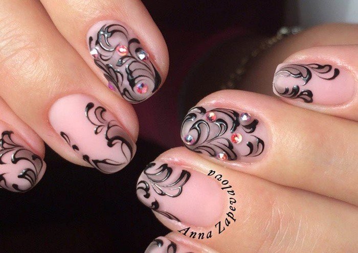 Дополнение узоров или выкладка стразами всего рисунка смотрится красиво и оригинально. Данный вид декора может быть гармоничен практически с любым дизайном. От тонкой сеточки из строгих прямых линий геометрии, до нежных и романтичных вензелей, не говоря уже о художественной росписи. Стразы будут лишь дополнением, минимальным вкраплением, элегантно подчеркивая дизайн ногтей в целом.