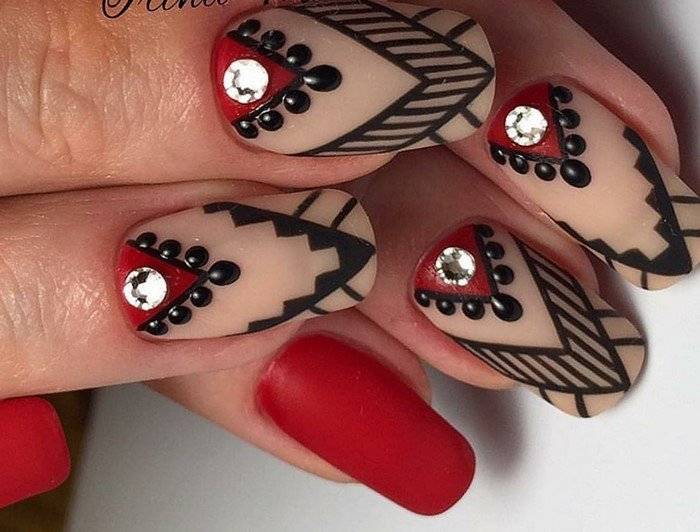Изображение «ловца снов» нередко встречается и в nail-дизайне. Акценты из декоративных камней подчёркивают креативность оформления и придают ему больше яркости. В этом стильном маникюре есть одно «но»: для коротких ногтей он не подходит.
