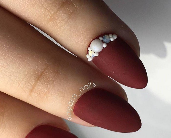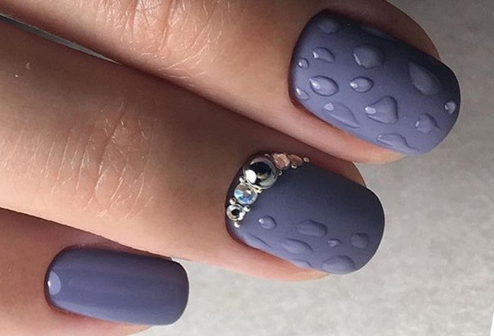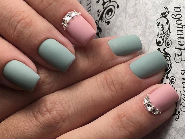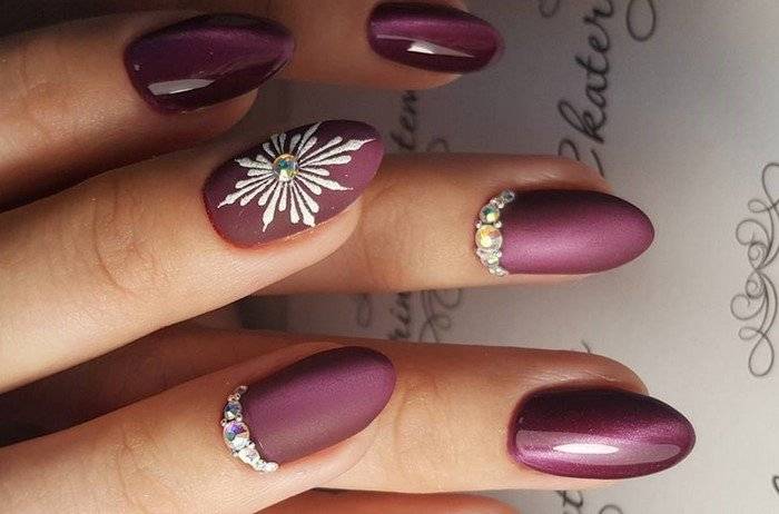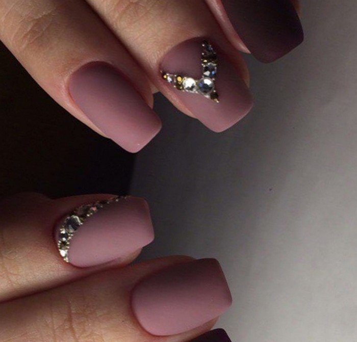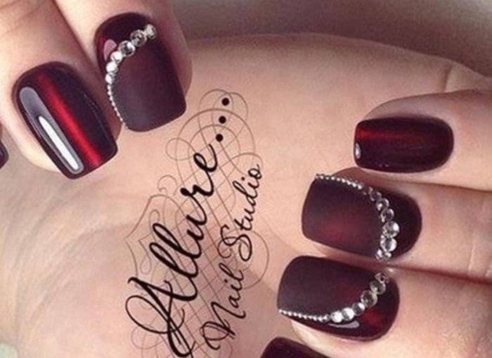 Модные тенденции в последние годы совмещают в себе объединение нескольких текстур – матовых и глянцевых. Комбинация этих двух элементов позволяет творить на ногтях настоящие шедевры. Объем и блеск страз создает невероятную игру света, а на матовом фоне он будет смотреться еще выгоднее.