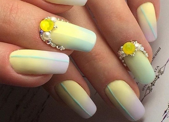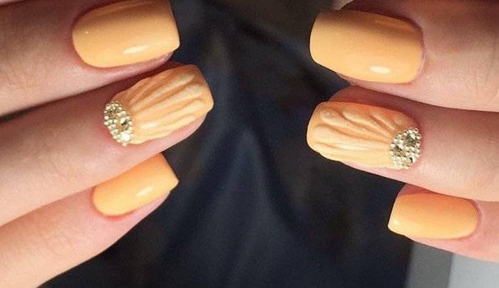 Вы заметили, что желтые оттенки в маникюре используют не так часто? А для декора на такой базе чаще всего выбирают рисунки или блестки. Но стразы очень эффектно сочетаются с теплыми желтыми тонами — банановый, желто-оранжевый, охра и др.