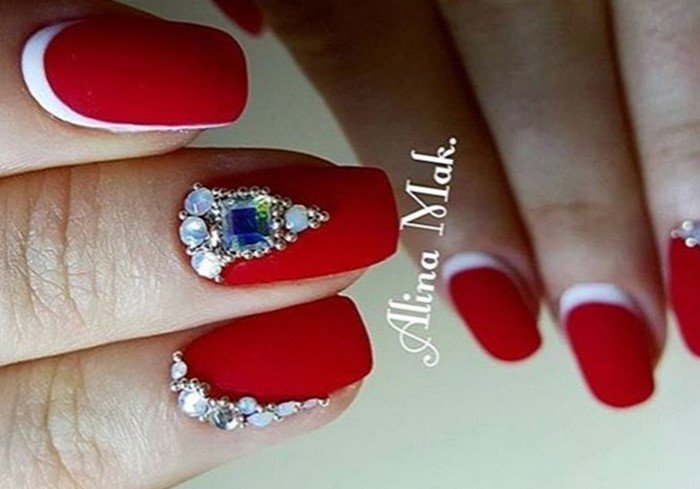 В зависимости от того, какую конфигурацию и величину имеют кристаллики, они могут служить как основой декора, так и прекрасным его дополнением. Для экстравагантного образа роковой женщины или светской дивы отлично подойдет маникюр красного цвета со вставками камешков.