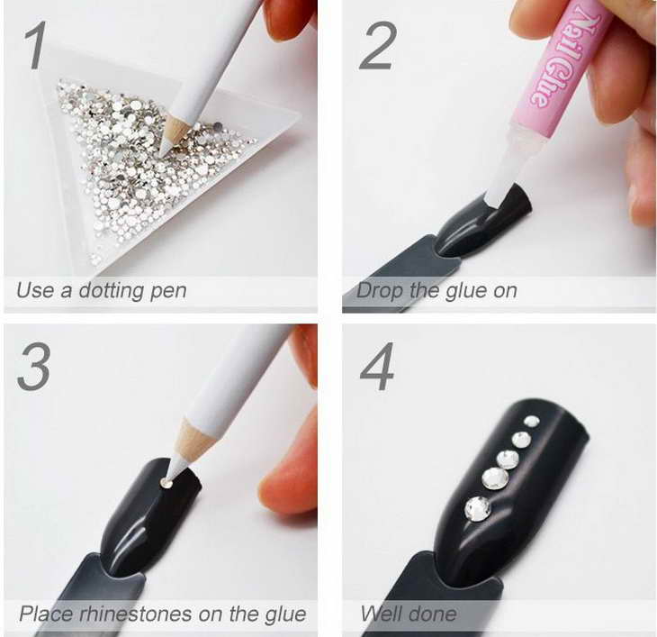 - Не давая второму слою основного лака высохнуть, аккуратно расположите на нем стразы. Используйте для коррекции расположения заранее предусмотренные инструменты.
