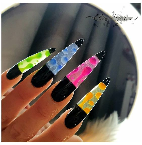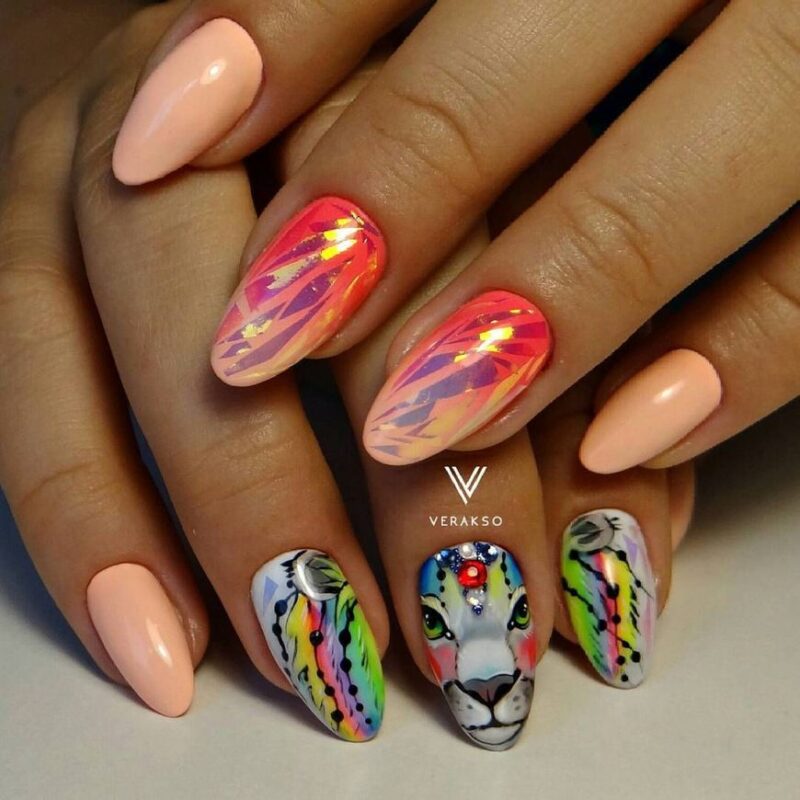 Такой маникюр выбирают самые яркие модницы, которые хотят быть в центре внимания. Дизайн моментально бросается в глаза, это один из самых крутых вариантов на лето, который вошел в новинки сезона. С ним лучше всего сочетаются надписи, геометрия и градиент. Пробуйте экспериментировать и воплощать в реальность свои самые неординарные идеи.