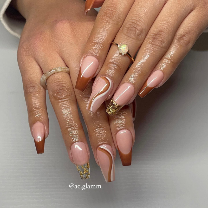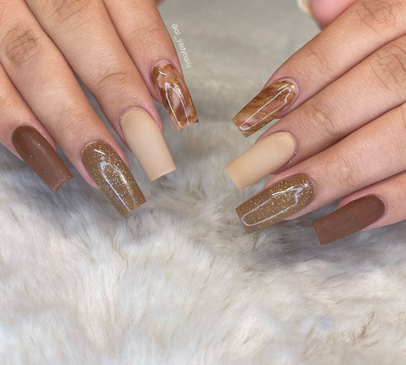 Это настоящий хит осеннего сезона 2022 года. Коричневый многим модницам уже надоел, а карамель внесет в дизайн разнообразие. Такой маникюр обычно выбирают спокойные и уравновешенные леди. Он прекрасен как в однотонном исполнении, так и с добавлением каких-либо элементов декора.