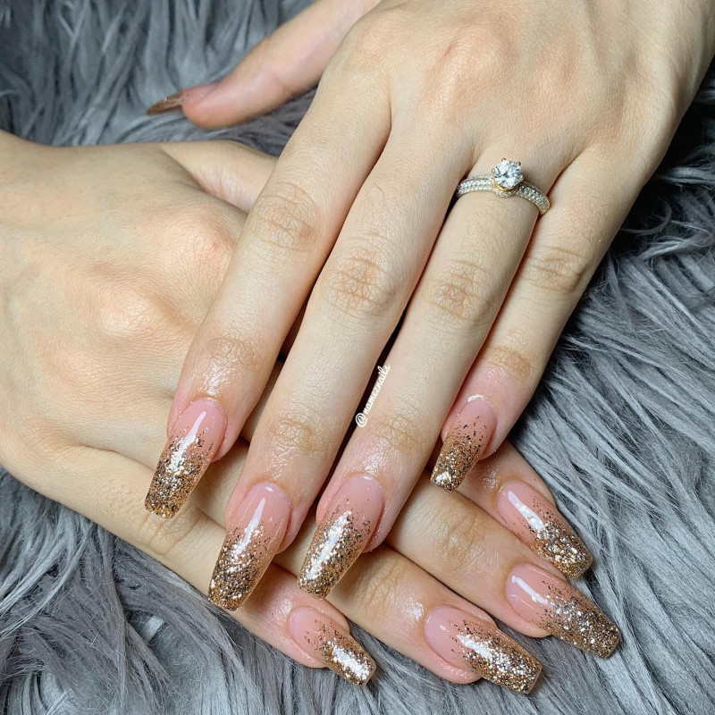 Гель-лак с глиттером используется для прорисовки края ногтевой пластины. Сочетайте глиттер с розовым, бежевым, серым, прозрачным фоном. Технология создания такого френча идентична цветному маникюру. Используйте для декора классические формы «улыбки»: овальную, треугольную.