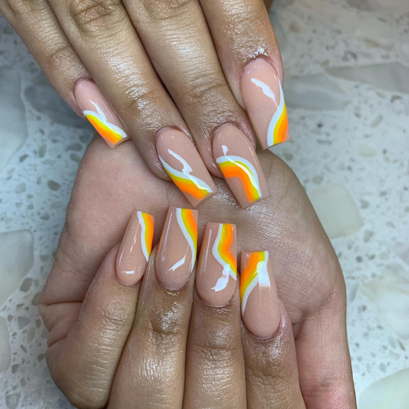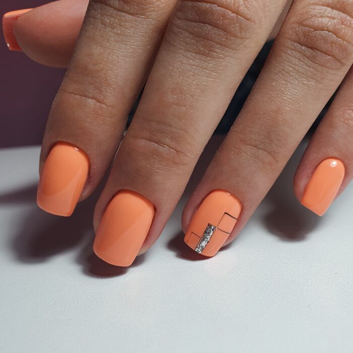 Этот мягкий цвет входит в модные новинки 2022 года. Это светлый и невероятно красивый оттенок, который сделает ваш маникюр интересным. Оранжевый всегда ассоциируется с позитивом и теплом, он отлично дополнит ваш летний образ. Попробуйте добавить рисунки в виде апельсинов или пальм. Будет выглядеть очень здорово и привлекательно.
