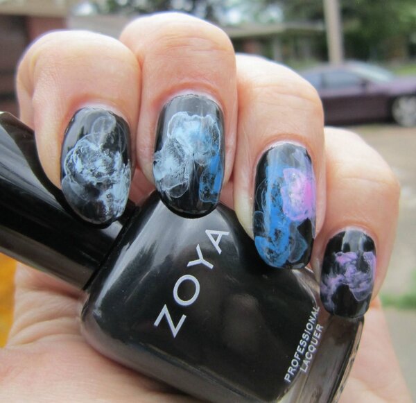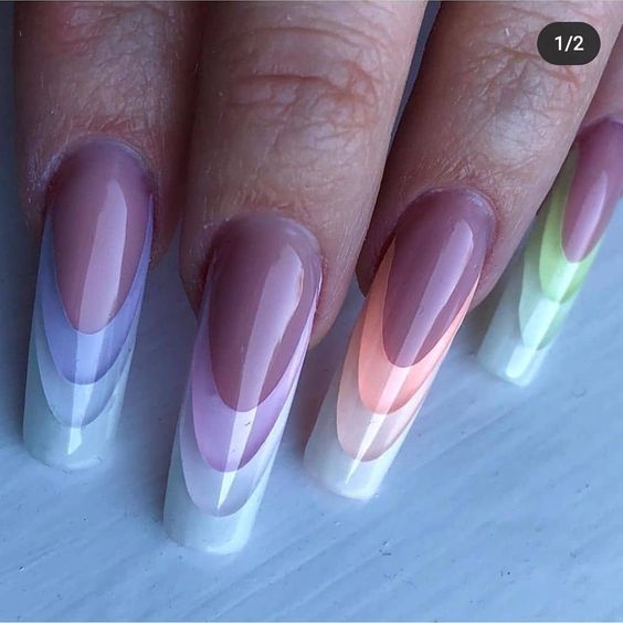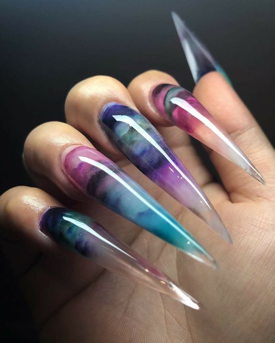 Элегантным украшением ногтей могут стать полупрозрачные цветные разводы, напоминающие акварельные. Чтобы добиться нужного эффекта, смешивайте цветные оттенки с бесцветным лаком.