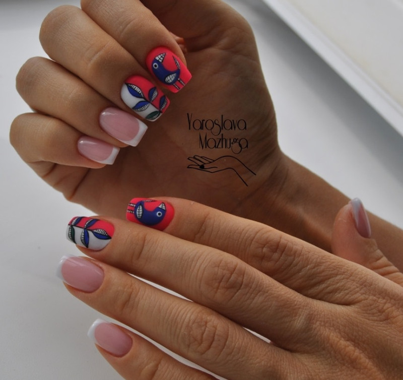 Французский маникюр с рисунком может быть как ярким, так и спокойным по цветовой гамме.
