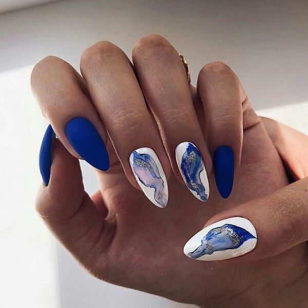 Актуально будет добавить рисунки геометрических фигур, птичек или белый горошек. Невероятно красивый дизайн можно получить, если покрыть все ногти матовым лаком, а на безымянный палец и мизинец нанести блестки. Такое оформление ноготков сегодня можно часто увидеть на фото голливудских звезд.