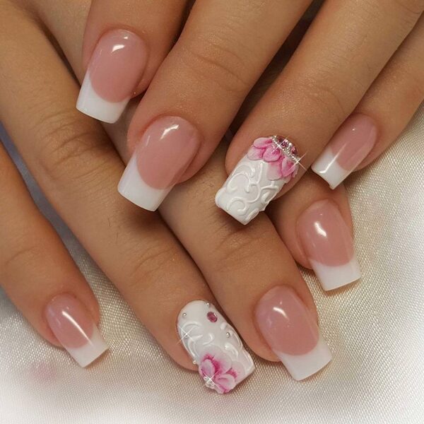 Шикарным и актуальным в весенне-летний период станет французский маникюр с рисунком цветов, которые создают прекрасное, позитивное настроение своей обладательнице, моделируя нежный и чувственный образ.