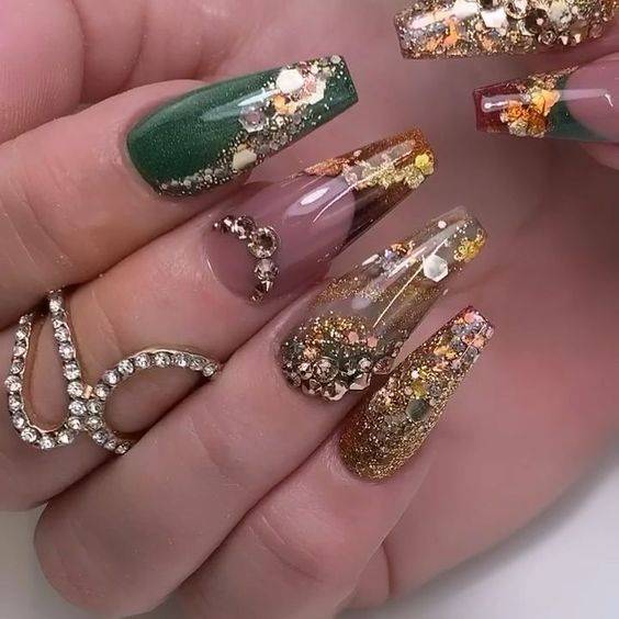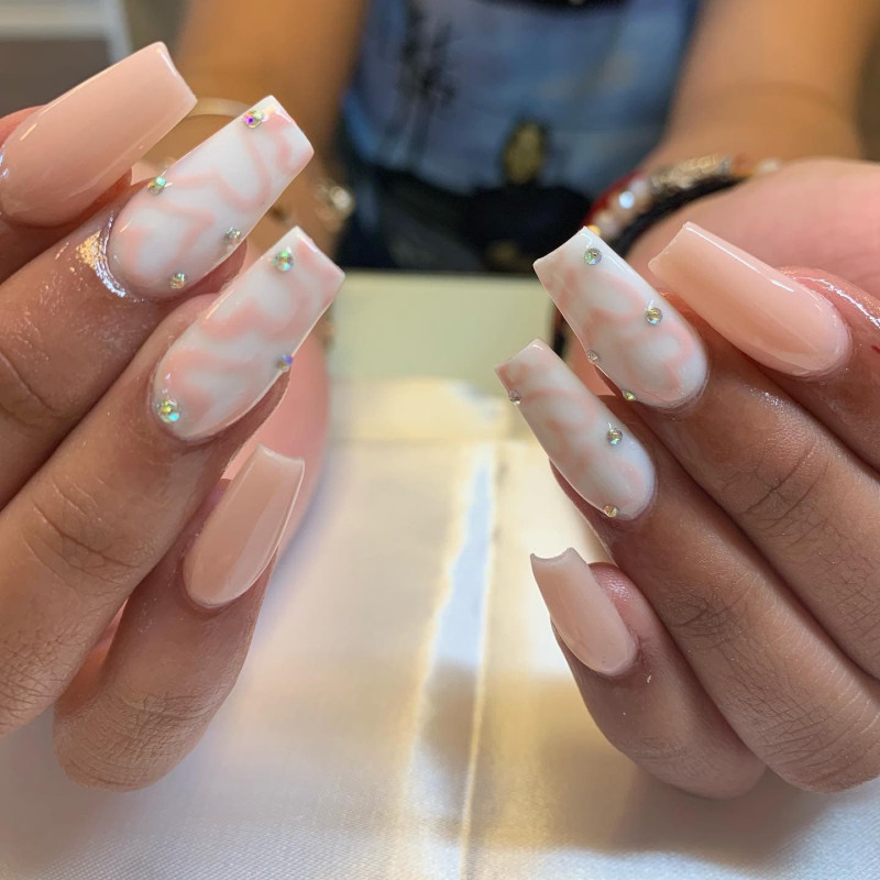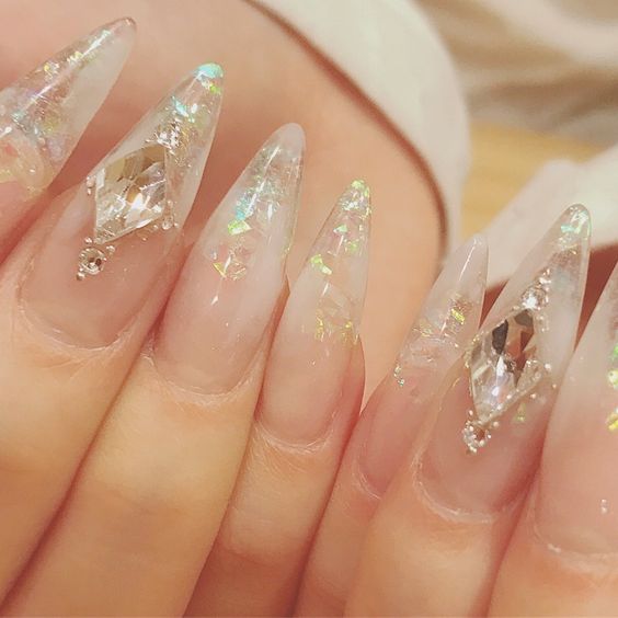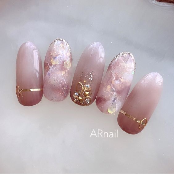 Но теперь текстуру кристаллов повторяют в самых разных оттенках, добавляя к цветным разводам еще и блестки, стразы, фольгу.