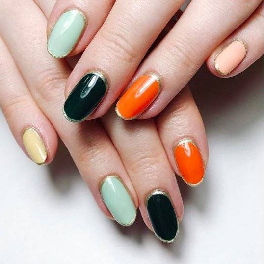 Сверху ногти покрывают серым, оранжевым и розовым гель-лаком. Для более яркого эффекта можно сверху нанести прозрачный блестящий слой.