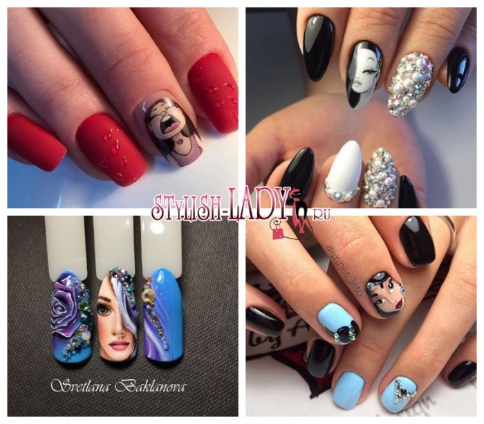 Красиво оформленное изображение лиц на ногте смотрится женственно и оригинально. Такой маникюр подходит для любого события.
