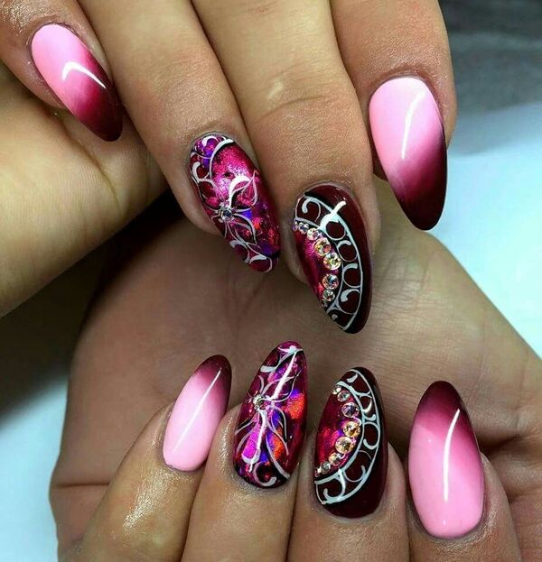 Этот цвет можно сочетать с другими оттенками и любыми техниками. Особенно интересен тандем малинового и серого, хорошо смотрится союз с черным, желтым и белым гель-лаком. Самый красивый маникюр можно создать при помощи техники омбре. Плавные переходы оттенков всегда пользовались спросом у дам благодаря эстетичному виду. С ним вы можете смело отправляться на подиум.