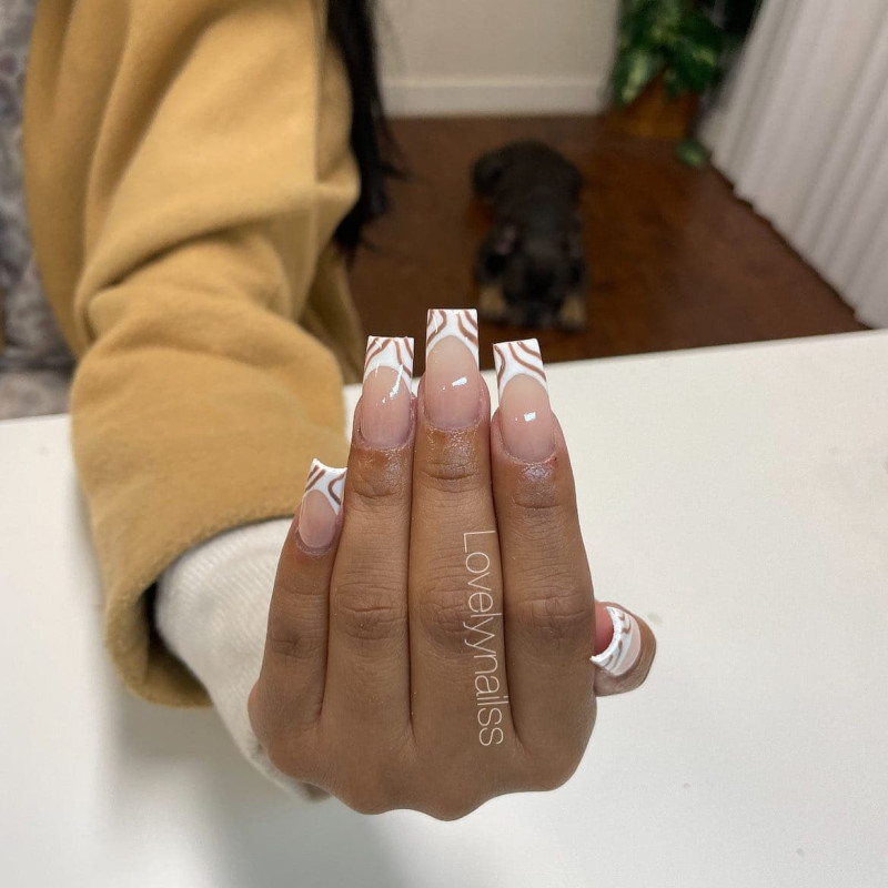 Не менее популярен сегодня модный французский маникюр с рисунком в абстрактной тематике, выше упомянутым геометрическим принтом, а также французский маникюр с рисунком кружевного узора.
