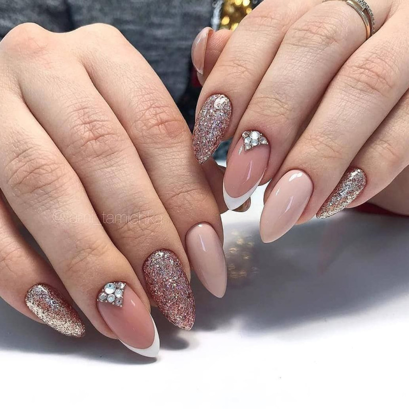 Глиттер часто дополняют другим переливающимся декором. Френч с глиттером отлично сочетается с жемчужной втиркой, особенно если речь идет о розовом или белом гель-лаке. Глиттер великолепно дополняет матовые пастельные оттенки, задает тон всему маникюру.