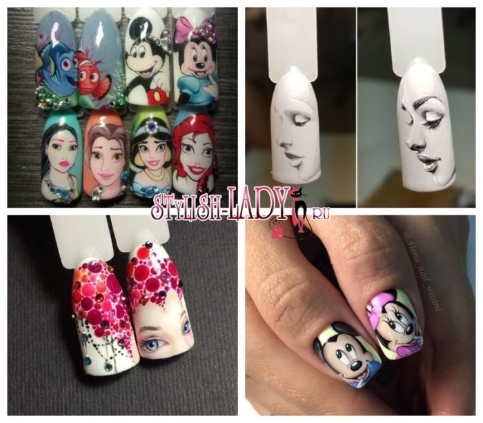 При желании создать яркий, веселый маникюр, на ногтях можно изобразить лица мультяшных героев, например Русалочки, Микки Мауса или смурфиков.