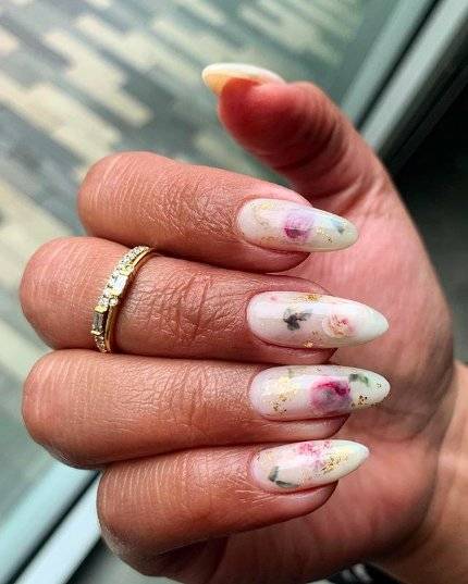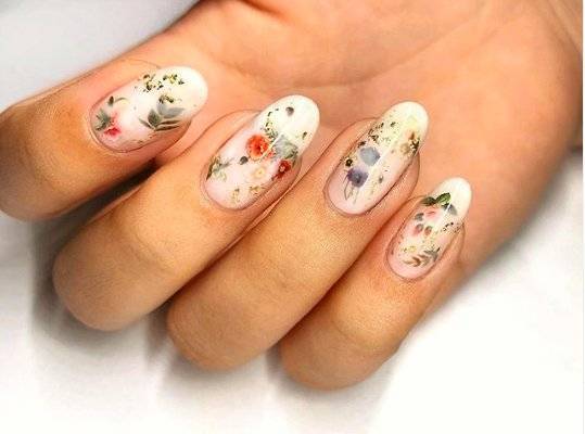 В женственном маникюре часто используют цветочные мотивы. Чтобы такой нейл-арт получился интереснее и элегантнее, создайте эффект засушенных цветов. Изобразите на ногтях мелкие цветы со стеблями и лепестками, а сверху покройте рисунок полупрозрачным белым или розовым лаком. Будет казаться, что цветки застыли в цвете, как будто между листами прозрачной бумаги в альбоме.