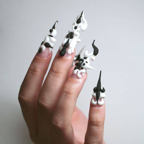Некоторые мастера предлагают наносить на ногти рисунок лица только контурно в виде эскиза, не прорисовывая деталей. Это можно сделать контрастным лаком, например, черным на белом фоне или белым на красном.