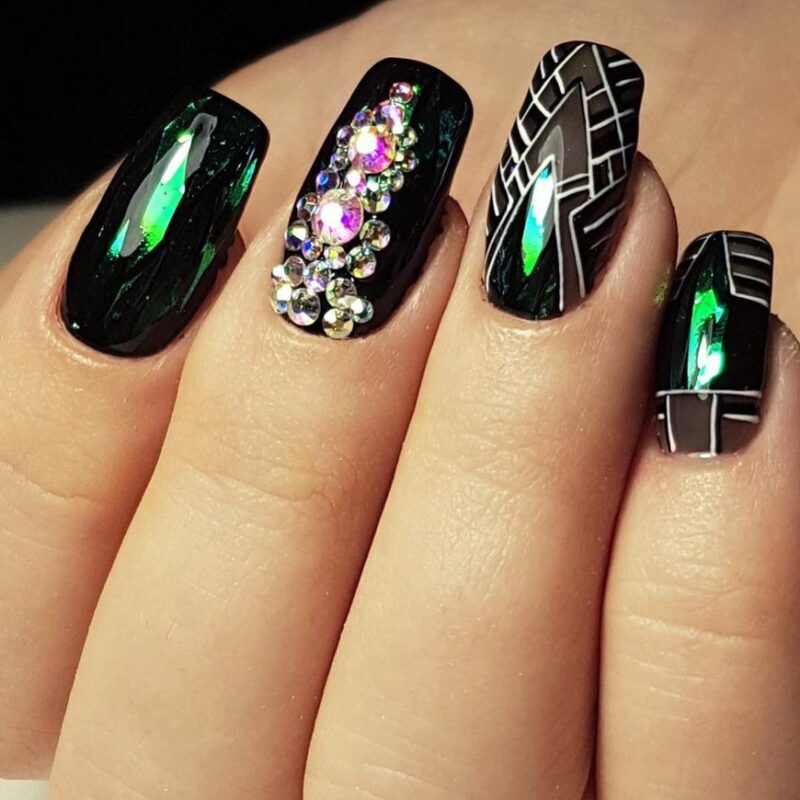 Они же могут служить украшением геометрического маникюра, добавляя ему сияния с эффектом металлик.