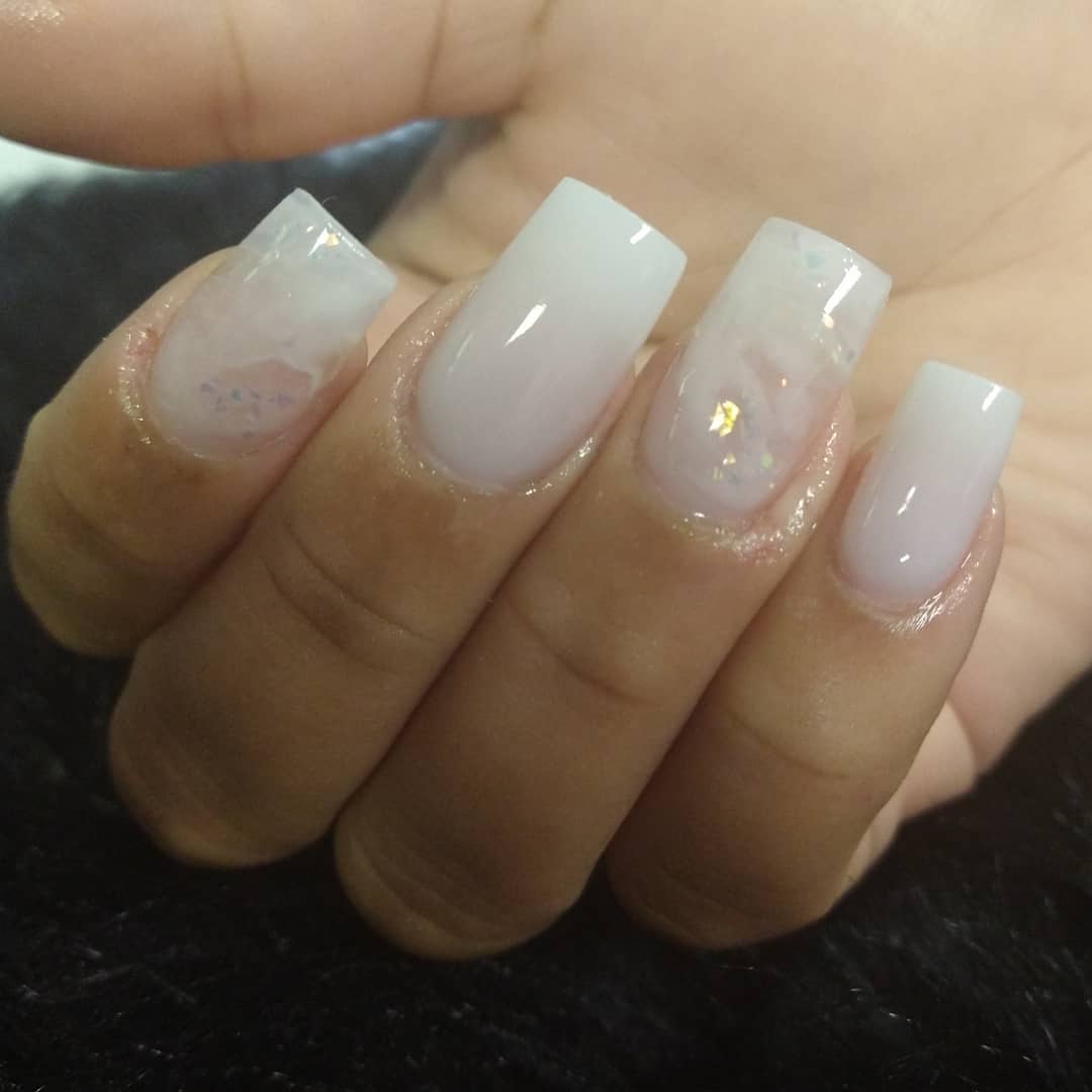 Эффект сияния допустим в элегантном маникюре даже на длинных ногтях. Главное — выбрать светлое покрытие с мелким шиммером, который будет мягко мерцать на ногтях, а не слепить блеском.