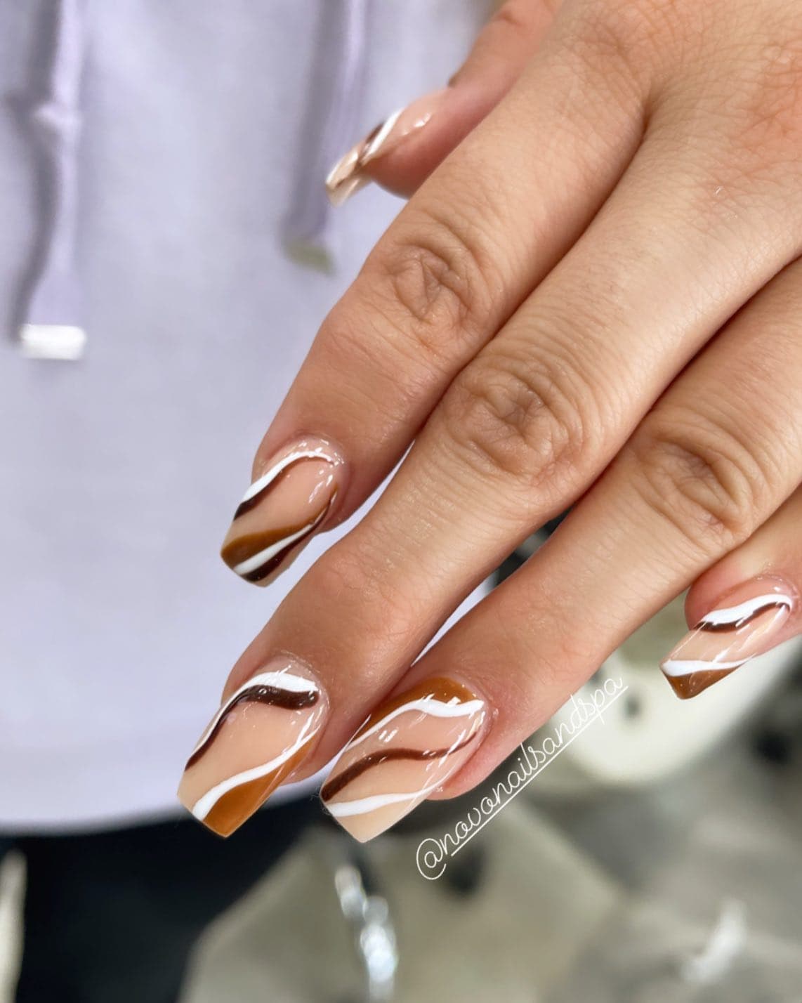 Такой маникюр позволяет продемонстрировать хороший вкус и раскрыть вашу творческую натуру. Добавьте на нейтральный фон немного хаотичных мазков, будто бы сделанных кистью художника. Позаботьтесь о том, чтобы цвета гармонировали друг с другом; результат будет говорить сам за себя.