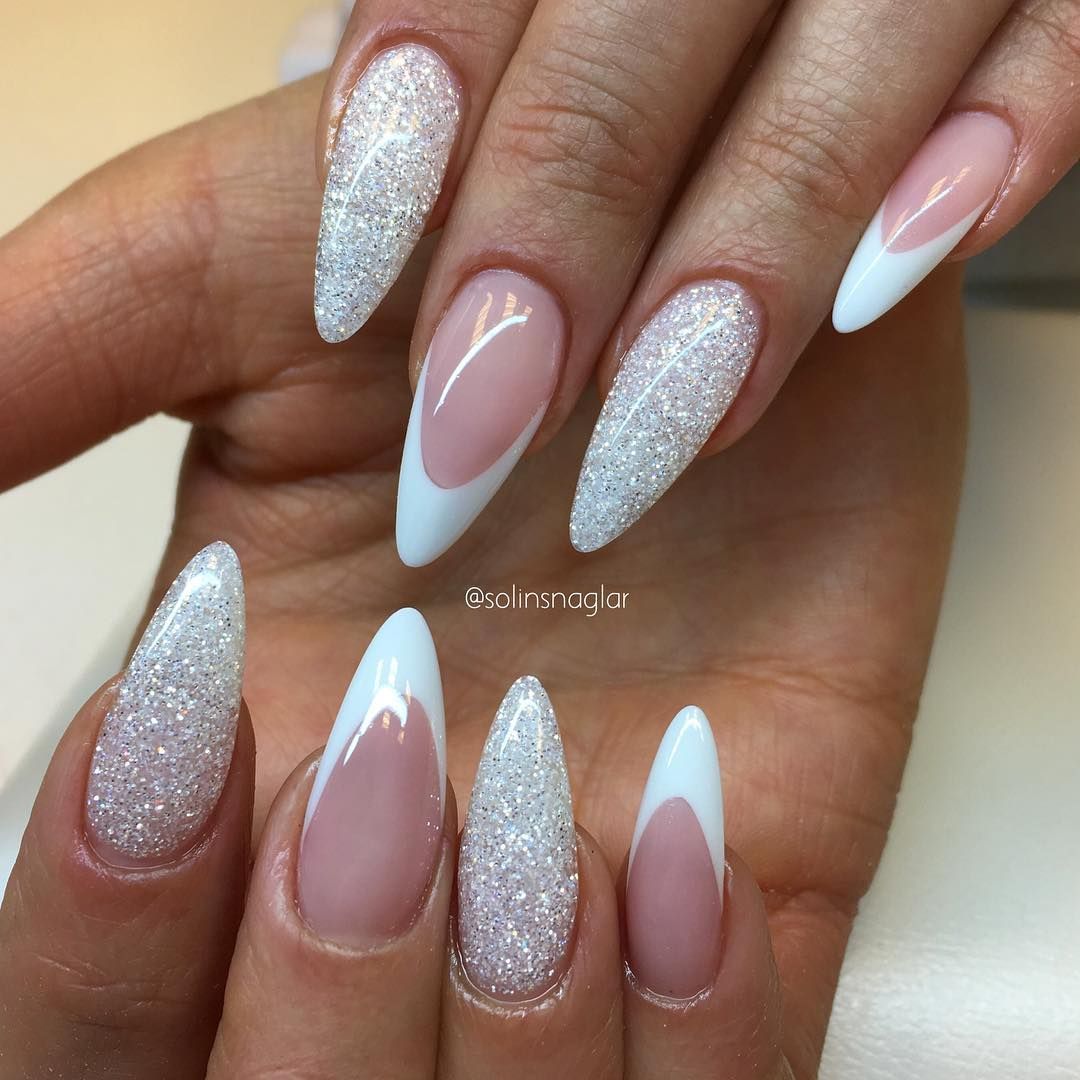 Глиттер часто дополняют другим переливающимся декором. Френч с глиттером отлично сочетается с жемчужной втиркой, особенно если речь идет о розовом или белом гель-лаке. Глиттер великолепно дополняет матовые пастельные оттенки, задает тон всему маникюру.